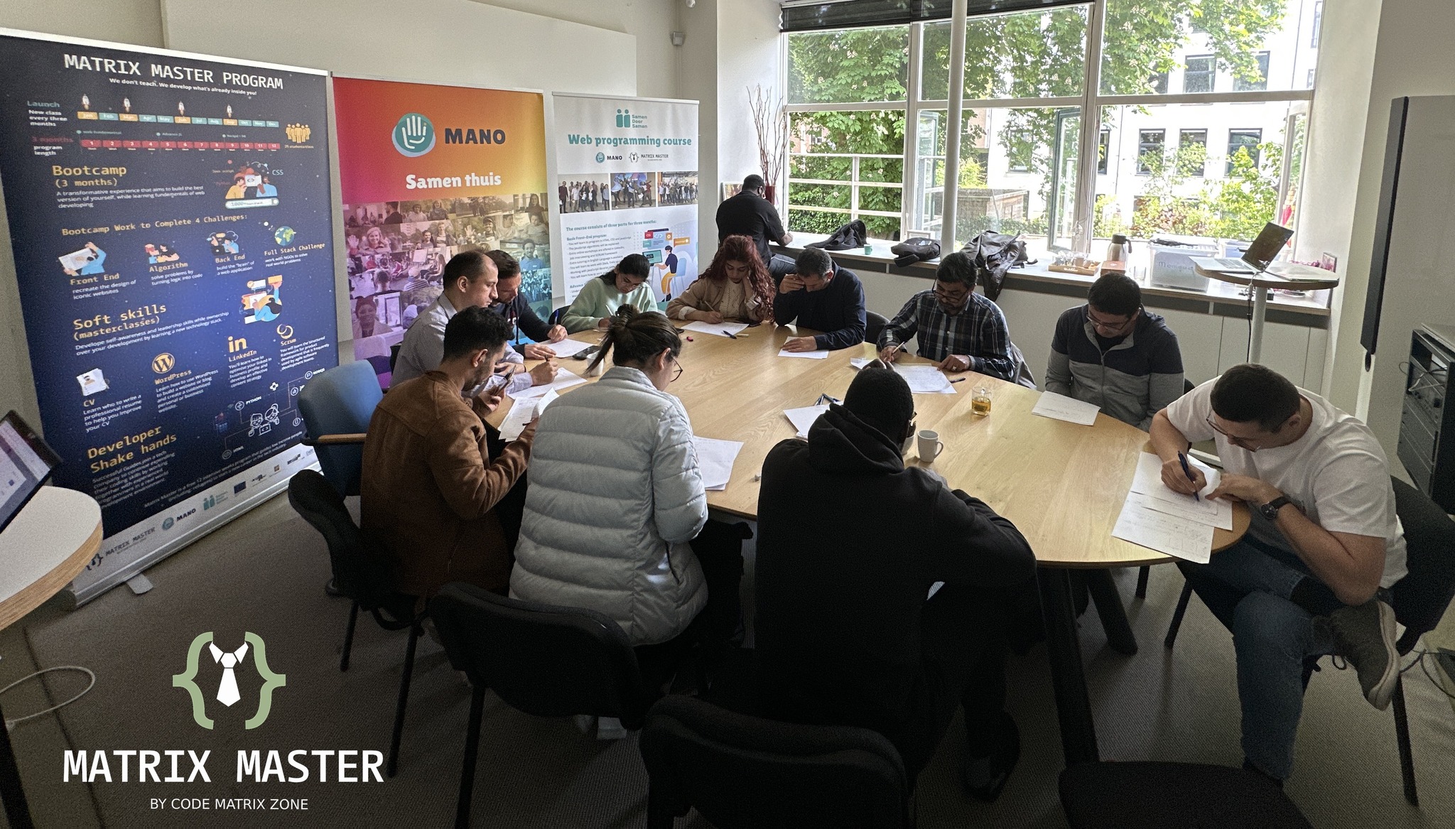 The Matrix Master Program is online, featuring two daily meetings. In the morning, there's a stand-up for updates with our guides, and in the afternoon, you attend the actual class. Between these sessions, you're free to study independently using our curriculum.